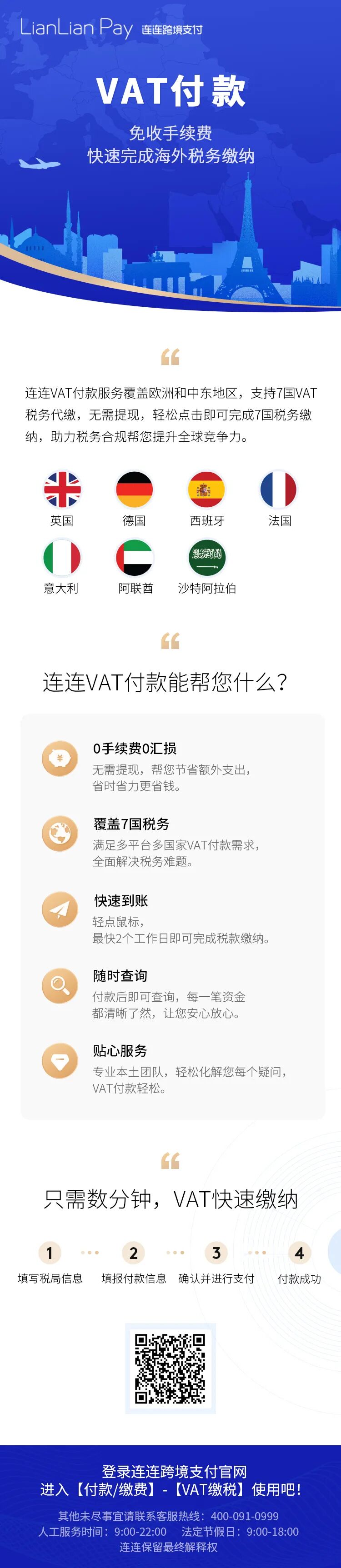面对当前形式下的多维打击,卖家更需要通过合规化的VAT付款抵御风险。为赋能卖家共渡时艰,连连跨境支付为卖家提供更高效的VAT付款。