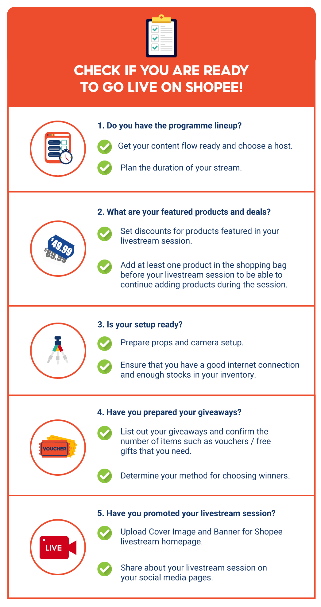 If you intend to feature discounted products or conduct giveaways, make sure you set up what you need (e.g. discounts and vouchers) and have a plan for how to carry out these activities before you Go Live.