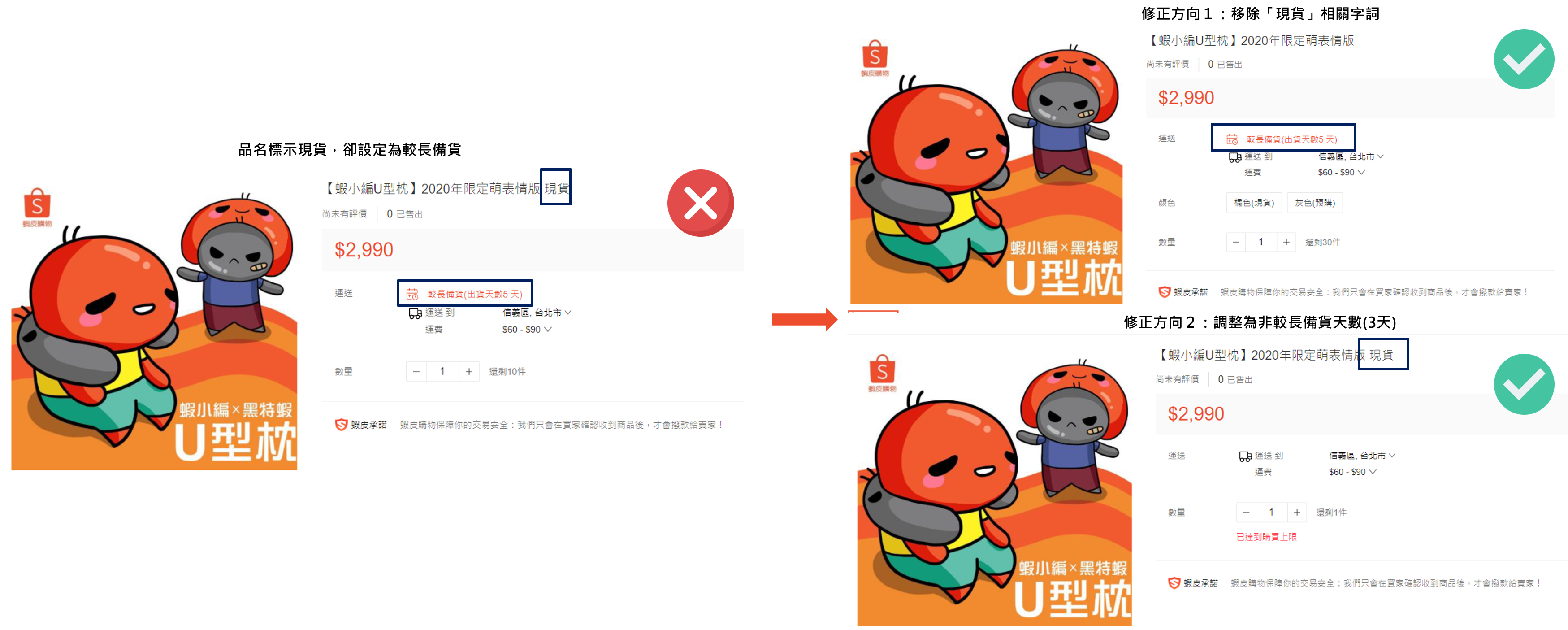 為確保商品頁面說明和買家體驗一致,您的商品頁面敘述需要符合現貨規範,即「現貨商品備貨天數不可超過3天」。