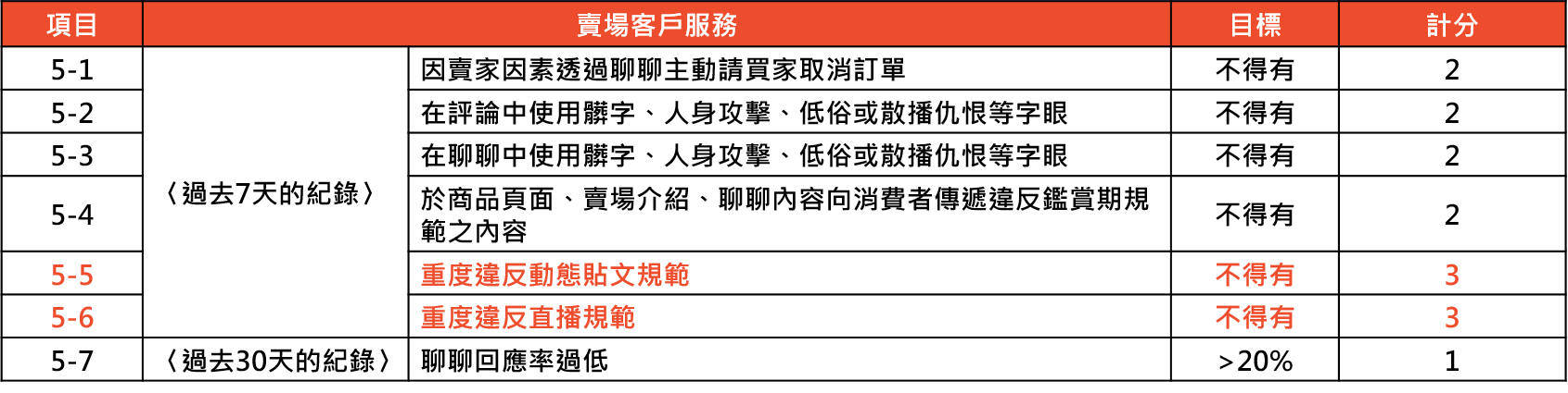 2.新增5-5及5-6项目,所有卖家于动态贴文及直播不得违反以下重度违规状况,虾皮会根据过去7天的纪录进行审核,若您违反下述之内容,将给予3计分