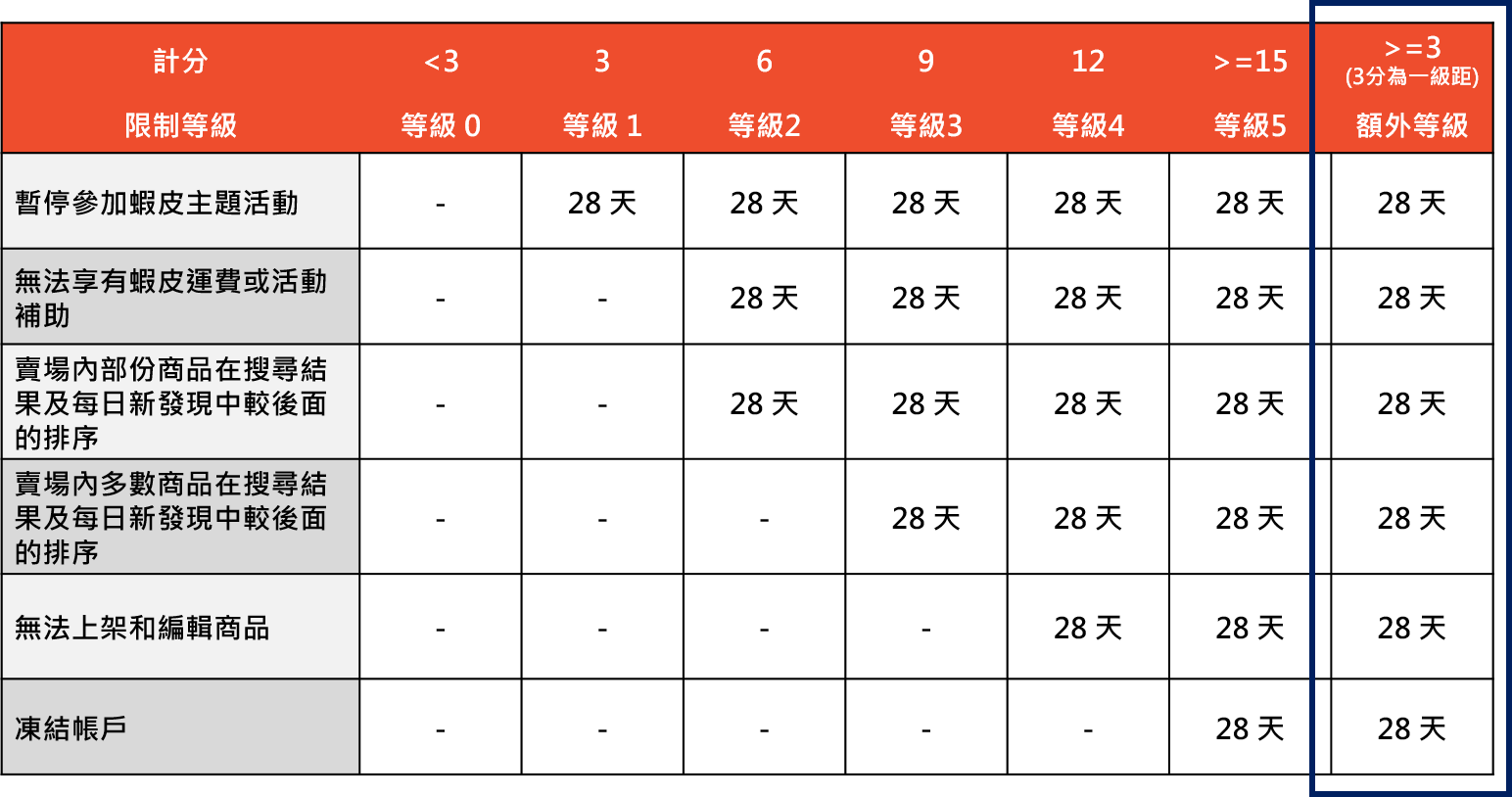 •达到等级5的限制:暂停参加主题活动、无法享有虾皮运费或活动补助、部分及多数商品会显示于搜寻结果及每日新发现页面中较后面的排序、无法上架和编辑商品和冻结帐户28天