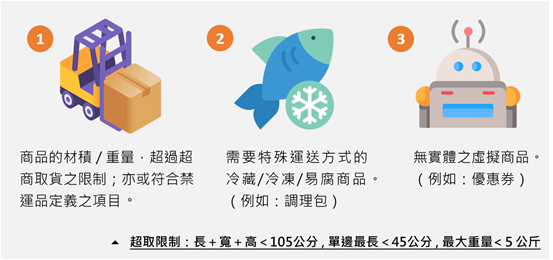 大致分為三大類:不符超商取貨限制、冷凍 / 藏商品、虛擬商品