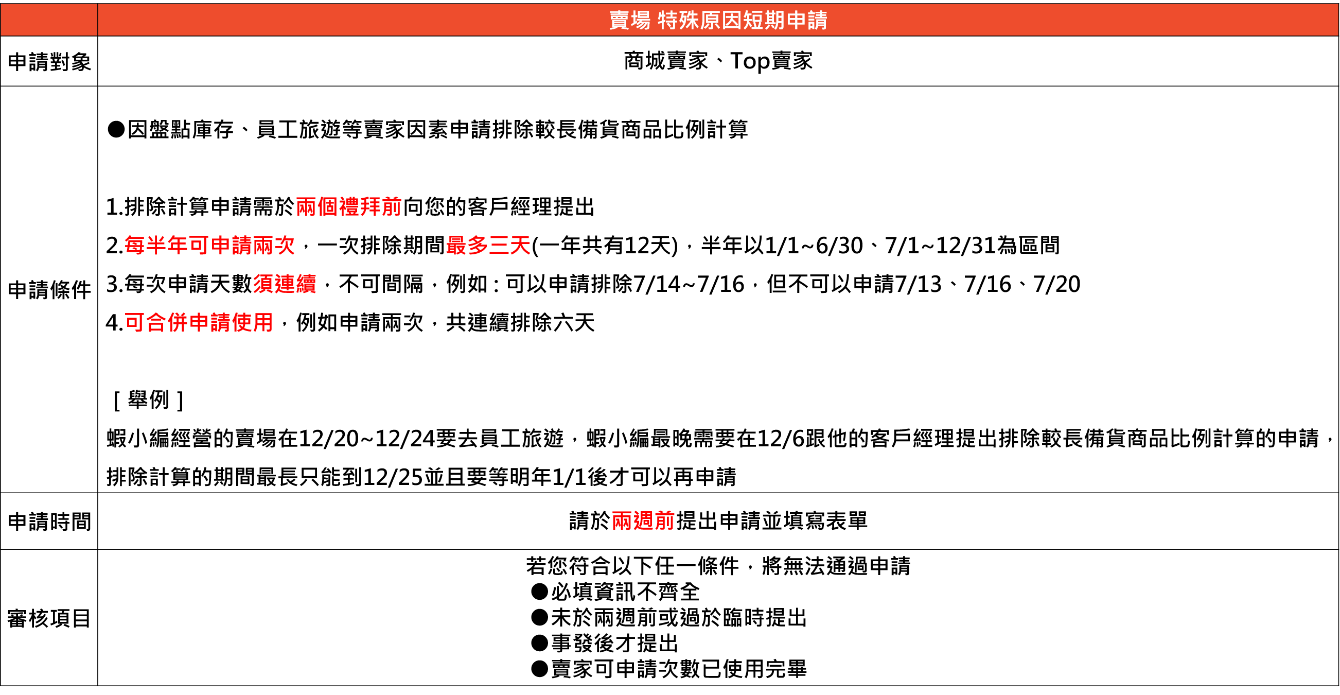 除了上述提及商品及賣場可以排除較長備貨商品比例之計算,若商城賣家及Top賣家有盤點庫存或員工旅遊等不可抗力因素,需要調整賣場大部分商品為較長備貨時,可以向您的客戶經理提出排除較長備貨商品比例計算之申請: