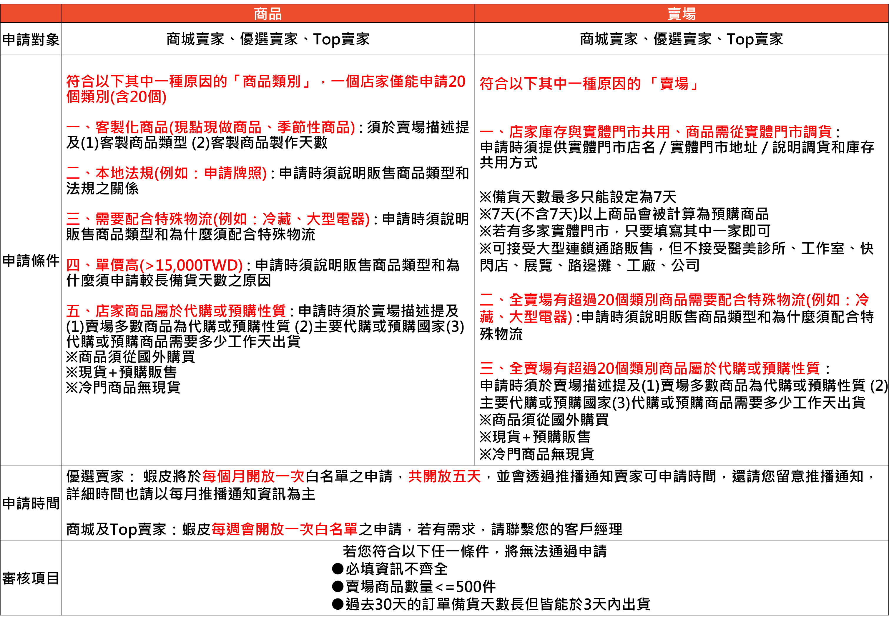 排除申請類別後,較長備貨商品比例仍需維持 < =10% ,若過去30天,賣場有超過5天較長備貨比例>10%,蝦皮將調整賣場商品數量為500件。