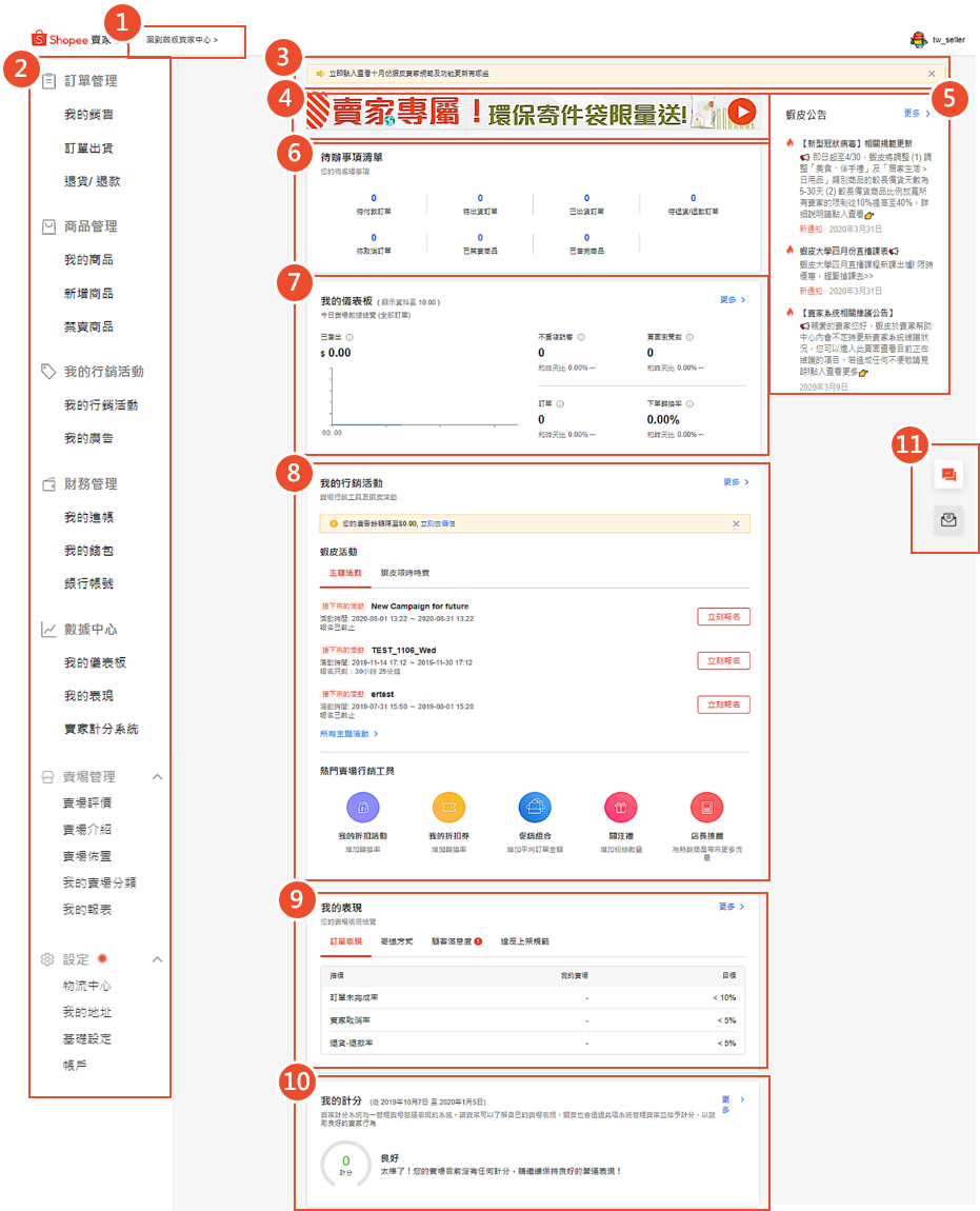 9.我的表現:您可於此處查看賣場表現總覽(訂單表現、寄送方式、顧客滿意度、違反上架規範),且可點選更多了解完整賣場表現數據
