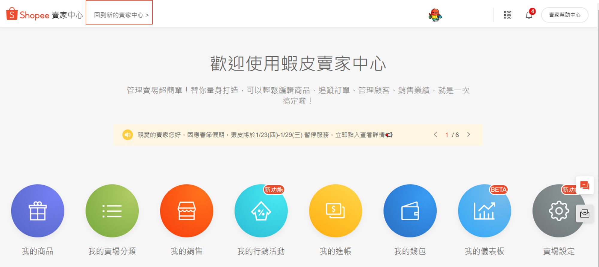 您可以点选卖家中心最上方标题列「回到新的卖家中心」,点选即可切换为新介面