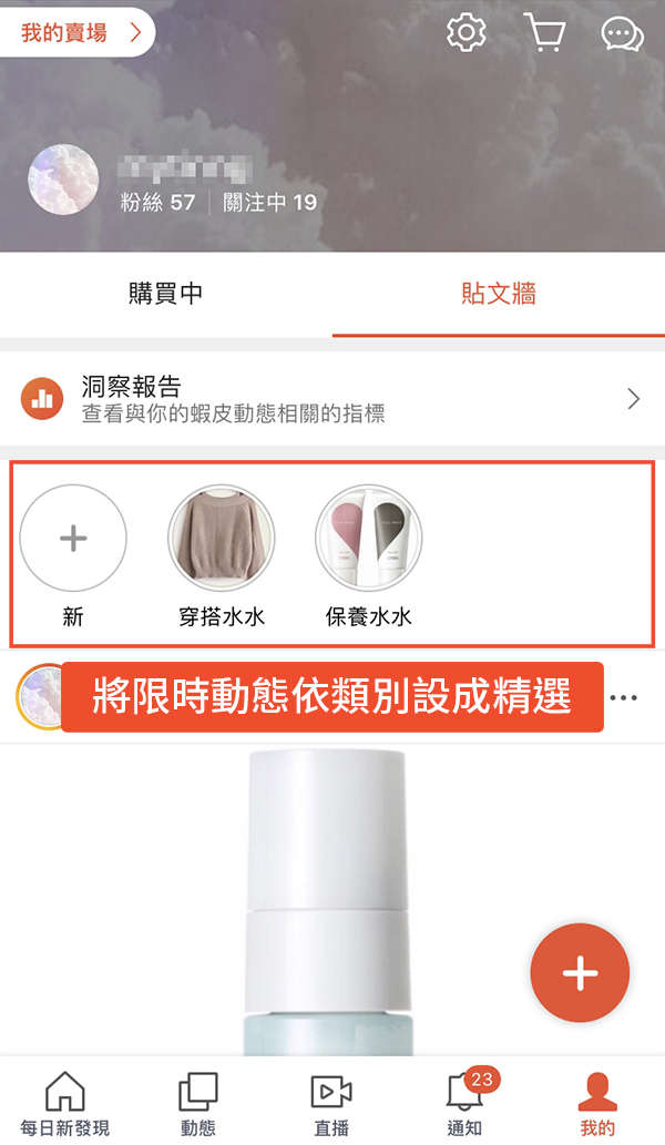 過去曾發佈的限時動態-在「我的」頁面,點選動態精選下的「+」,並選擇過去曾發佈的動態,將其集合成精選集。