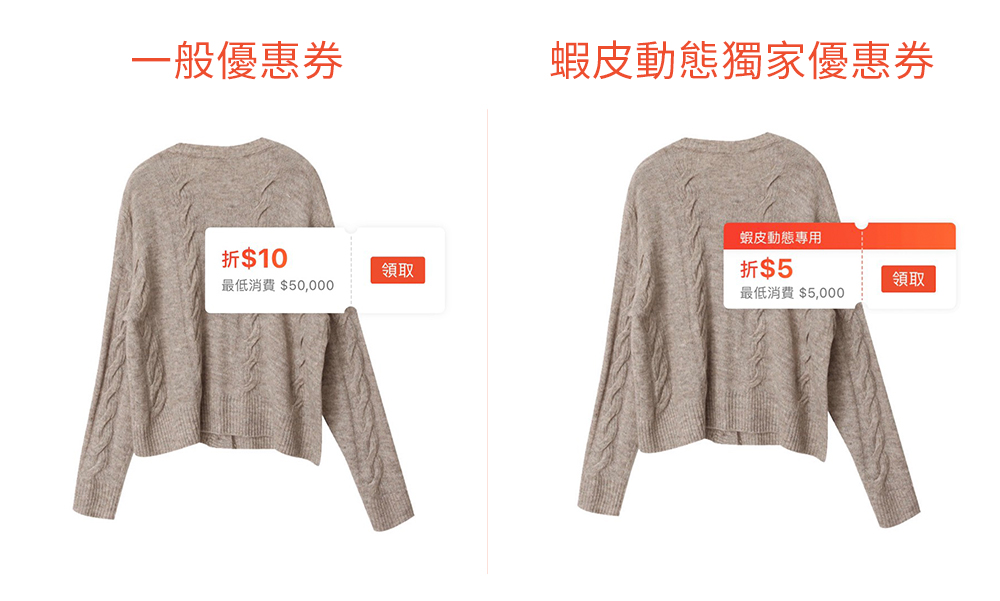 小撇步:蝦皮動態專用的優惠券可以幫助您增加貼文的新流量和經常性瀏覽率。關注者能夠透過瀏覽貼文,以獲得其他地方沒辦法領取的優惠券。