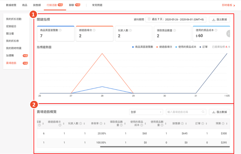 您可以查看每一檔賣場遊戲的成效表現(玩家人數、參與率、領取獎品數量、使用獎品數量、訂單和銷售額等)