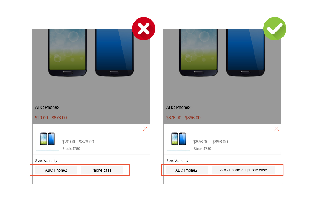 For example, if you are selling a smartphone package — smartphone (worth $750) and a phone case (worth $10) — your product listing should include the following variations: