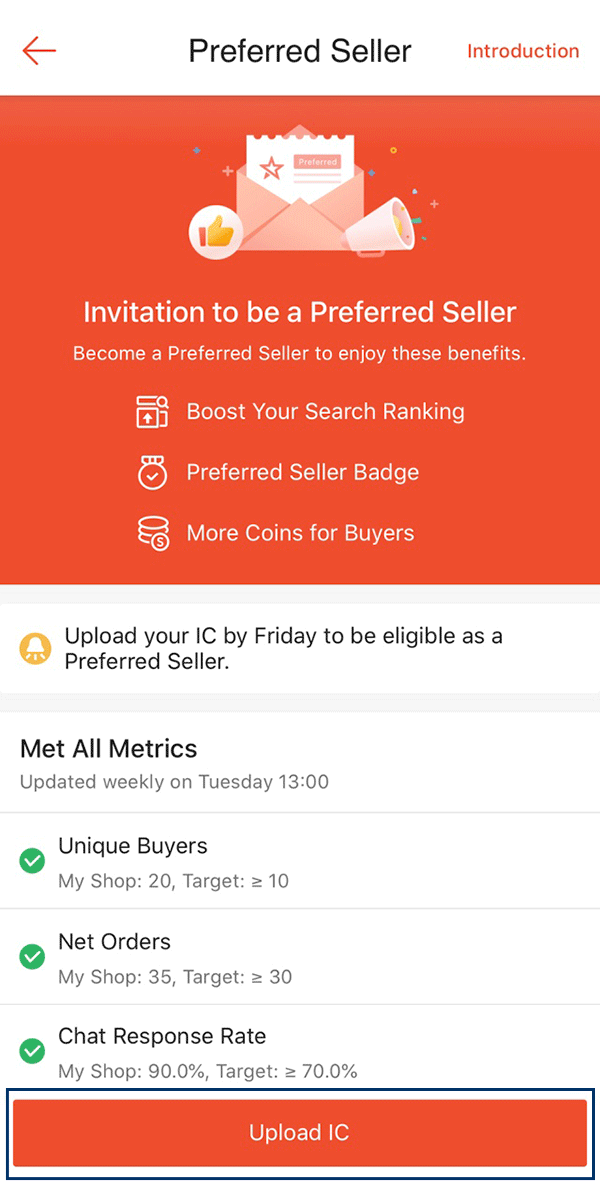 You can also opt in via the Preferred Seller page on the Shopee App by selecting Upload IC.