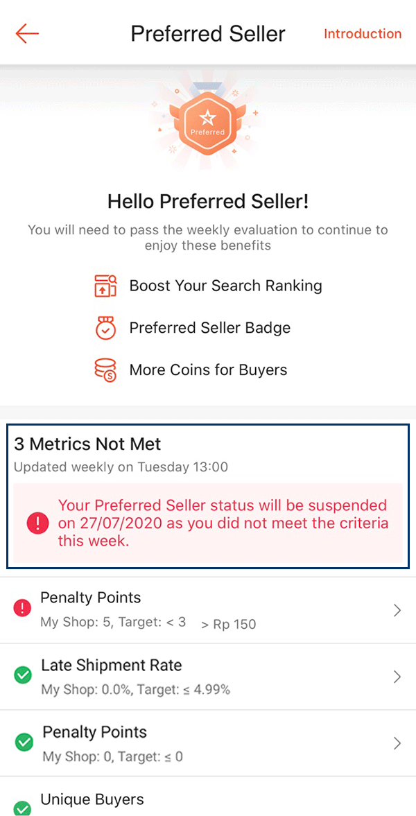 However, if you do not take corrective action to achieve the required performance targets, you will lose your Preferred Seller status. You can see the specific date for status removal on the Preferred Seller page.