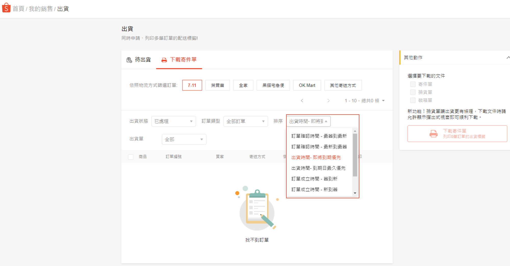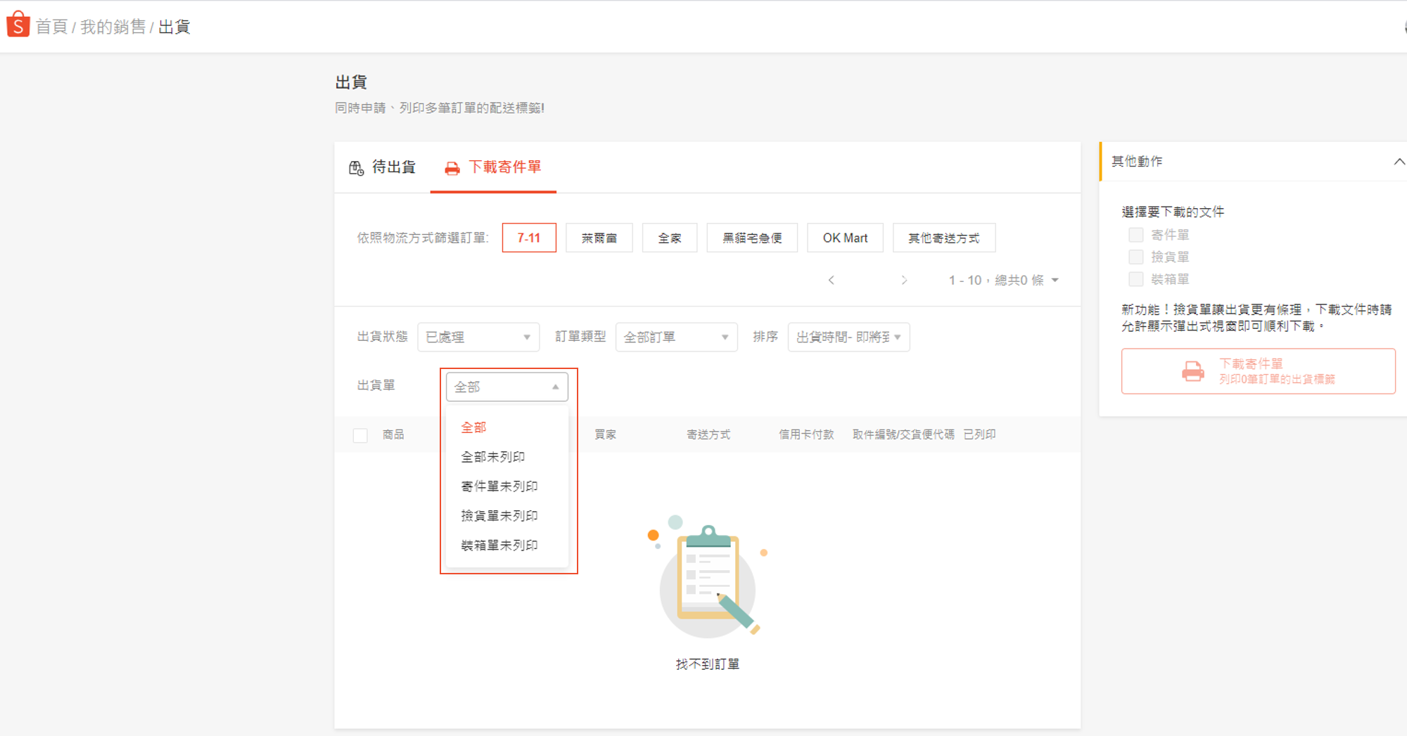 您可以於下載寄件單頁面篩選未列印的寄件單、撿貨單、裝箱單的訂單