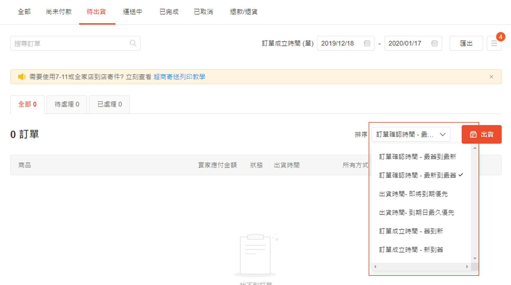 您可以於我的銷售>待出貨>已處理訂單頁面依照訂單確認時間、出貨時間和訂單成立時間排序訂單。