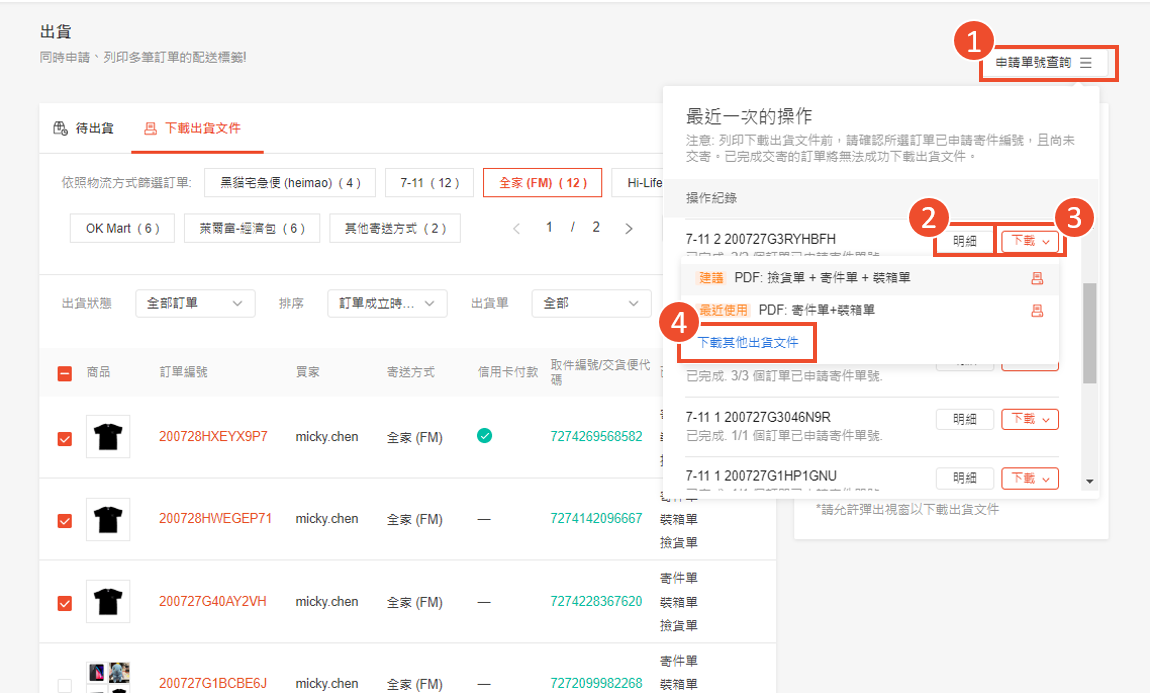 6.您可以至賣場管理 > 我的報表 > 出貨文件,查看已完成下載的出貨文件