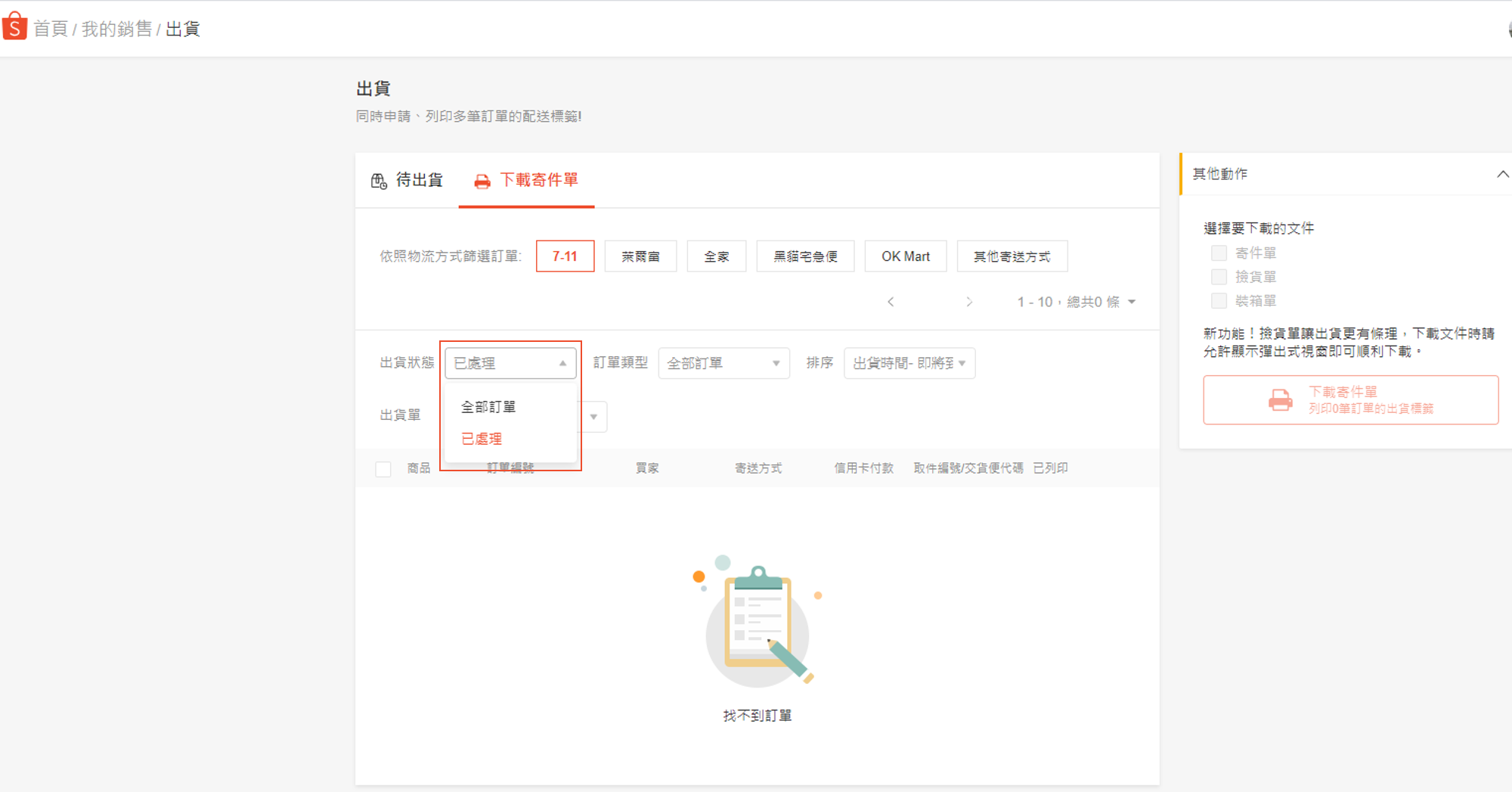 您可以於下載寄件單頁面篩選已處理的訂單以列印配送標籤