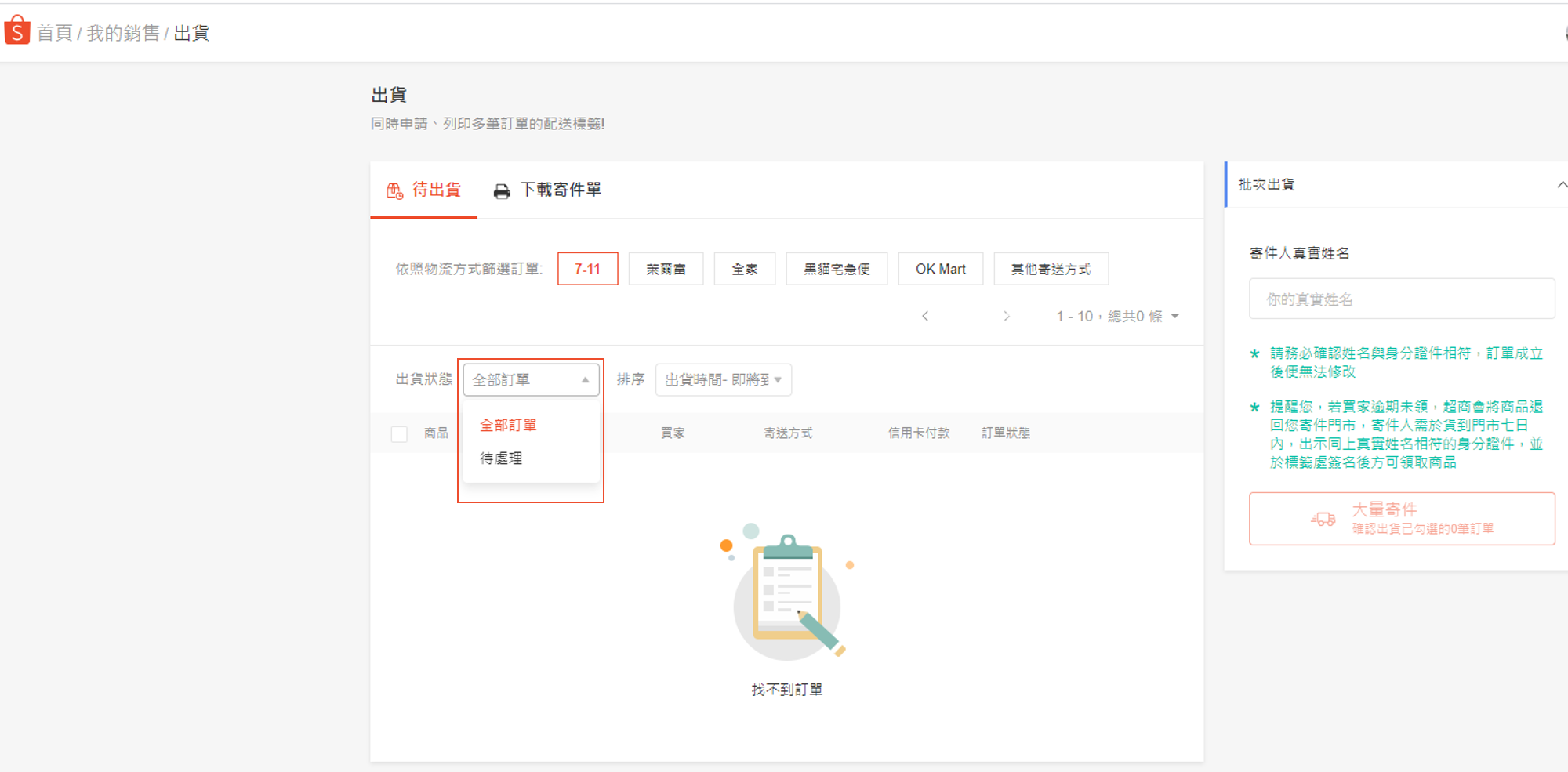 進入我的銷售>出貨>待出貨/下載寄件單頁面