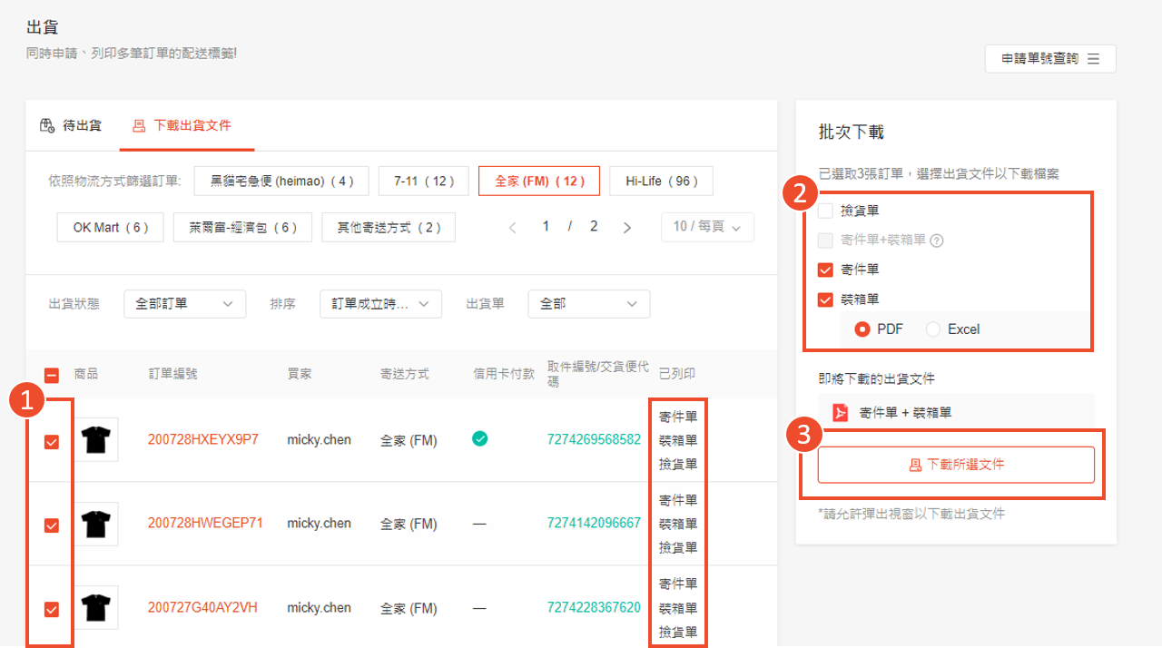 3.勾选完成后点选"下载"欲列印的出货文件(订单后方会记录文件的列印状态)