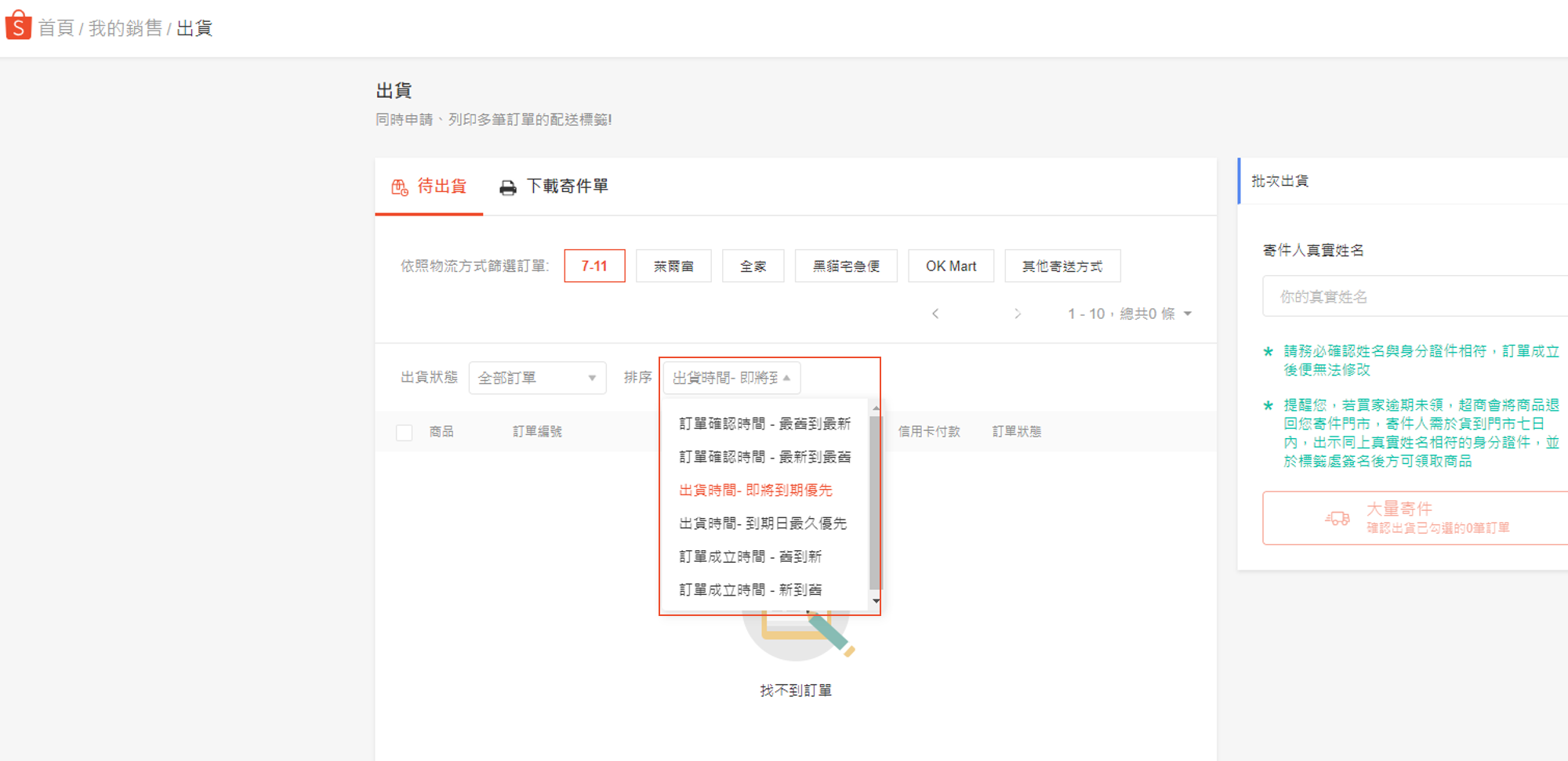 您可以于待出货页面筛选待处理的订单以安排批次出货