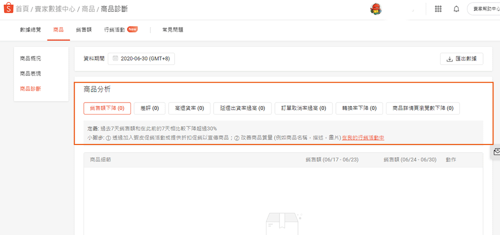 透過「賣家中心>左側選單:數據中心>賣家數據中心>商品」,可以查看銷售較差的商品資訊,並且針對這些商品做出調整。
