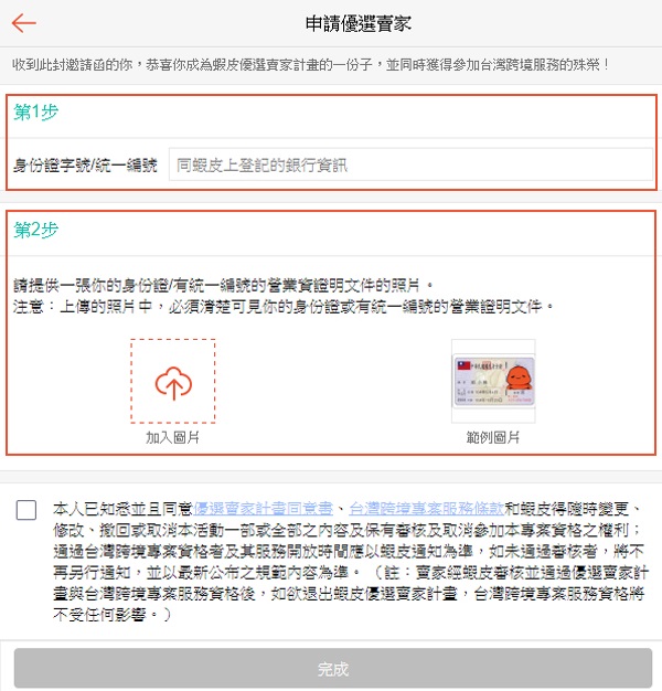 接著請您先詳閱優選賣家規範,然後填寫資料並提供身分證或營業資料證明文件照片。蝦皮在收到您提供的公司或個人資料後的15天內將進行審核,若資料無誤將會透過推播通知您加入成功,還請您留意推播訊息。