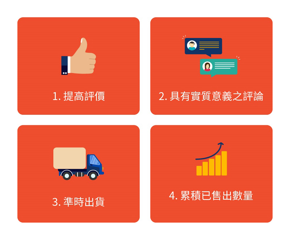 擁有許多買家好評的商品將具更多可靠性。您可以透過確保良好的商品品質、準時出貨和完善的客戶服務來爭取較高評價。
