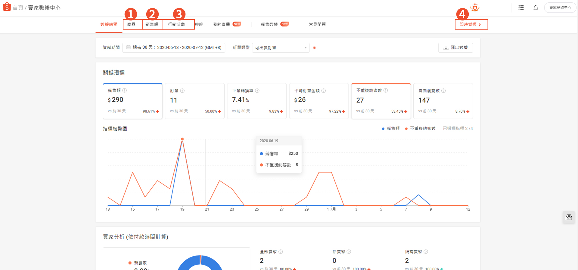 銷售額-為您提供詳細的銷售數據,包括訪客數量,買家數量和訂單數量。