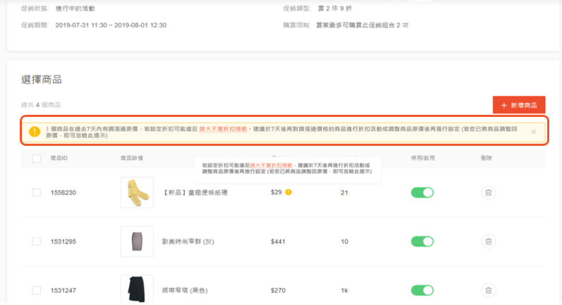 為了降低賣家因誇大不實折扣規範被下架商品的情況,系統新增誇大不實折扣提醒。
