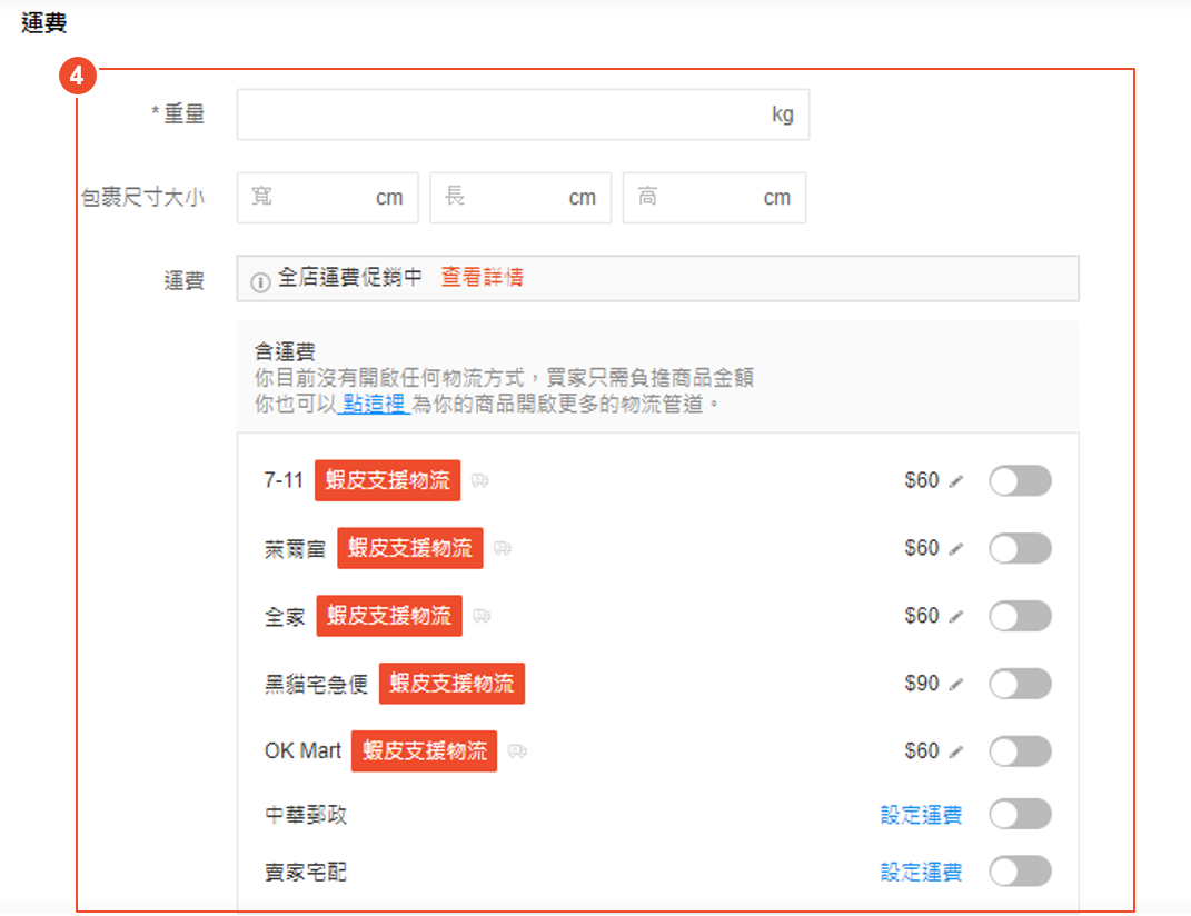4.填寫商品重量、包裹尺寸大小以及選擇要開啟的物流方式