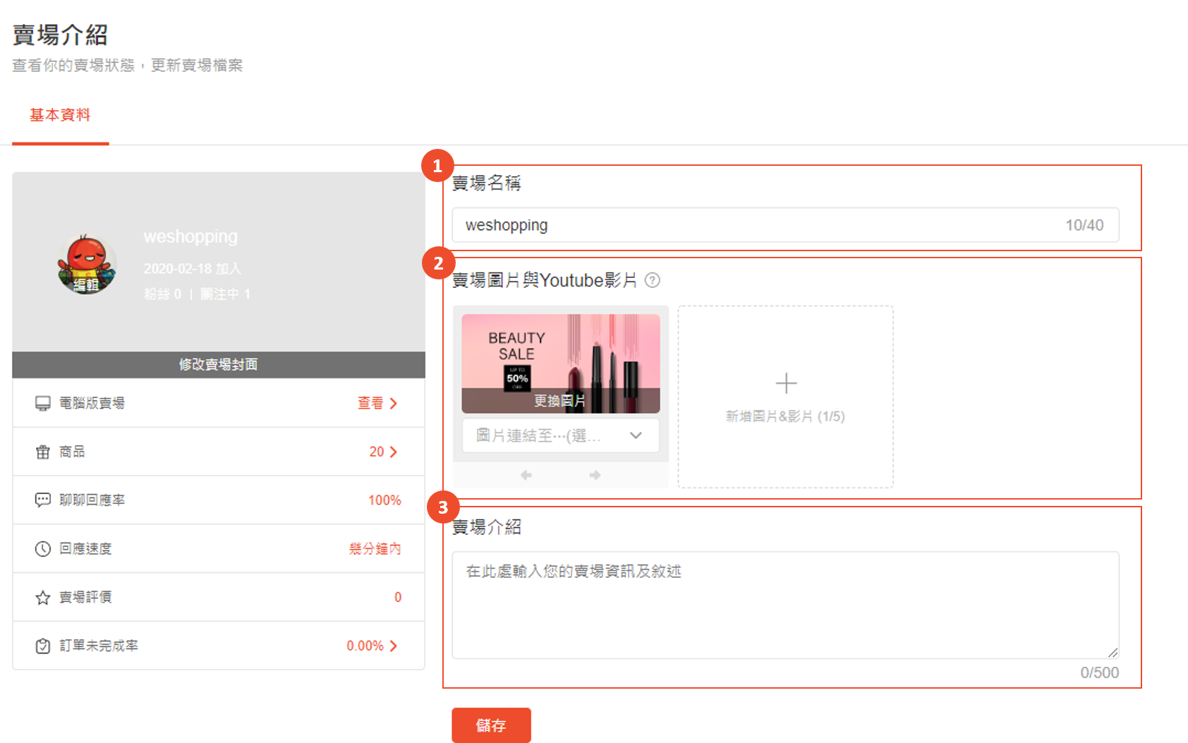 賣場介紹可以包含您的賣場商品類型、聊天回應時間等訊息,請勿於賣場介紹內提供電子郵件或電話號碼等個人聯絡資訊,或要求買家於蝦皮購物以外進行交易。(賣場介紹最多500字)