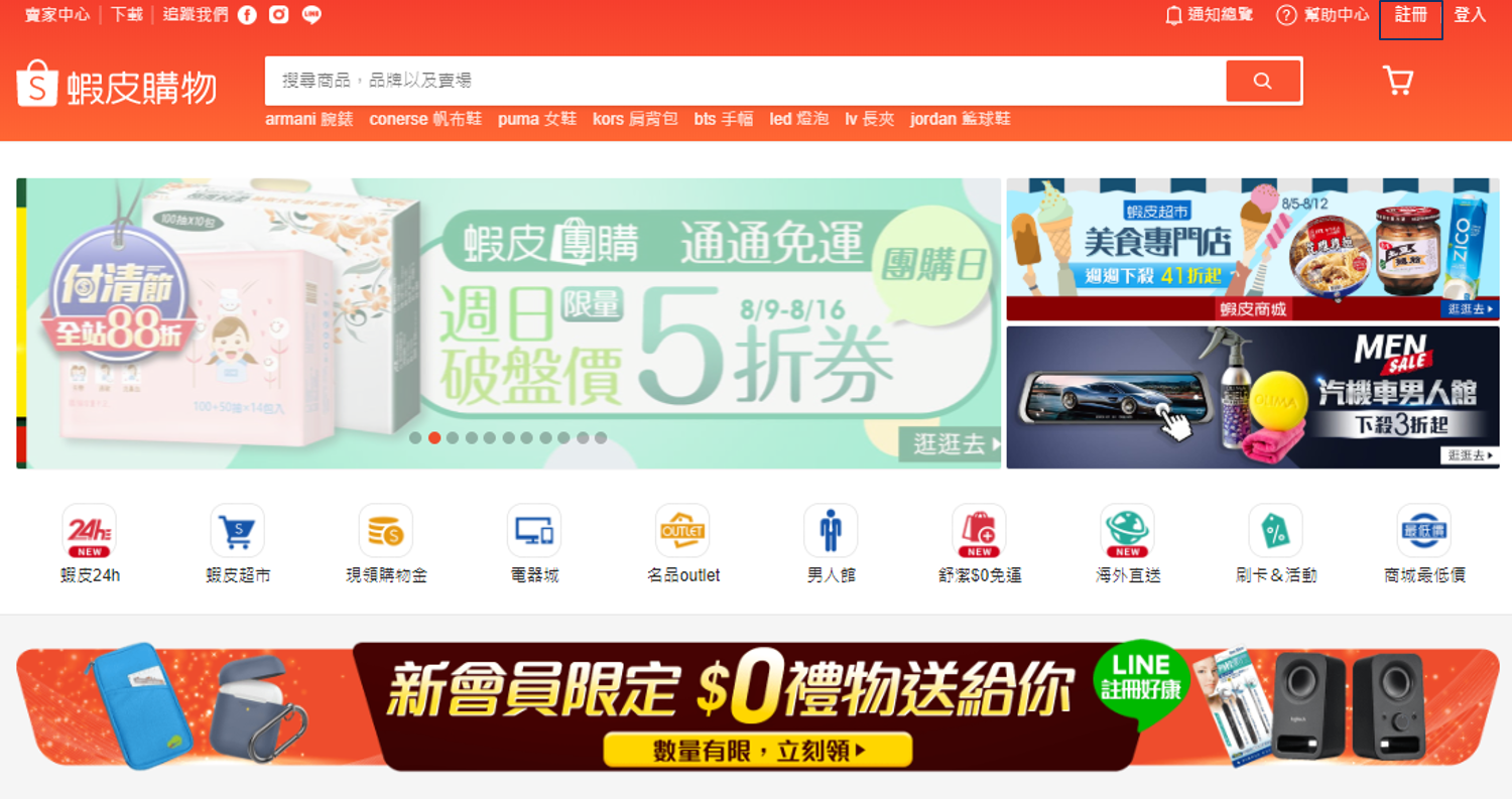 1.進入蝦皮購物首頁,點選註冊蝦皮帳戶