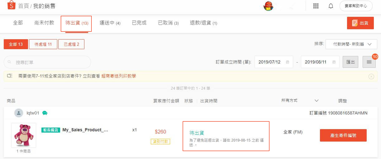 進入賣家中心,我的銷售,點選待出貨查看待出貨訂單