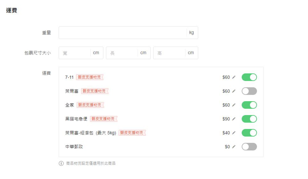 包含三個部分:商品重量、包裹尺寸大小、運費(商品物流選項)