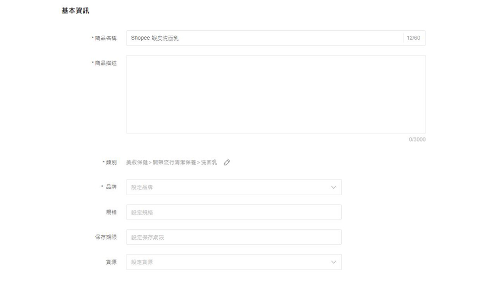 小提醒:根據您選擇的商品分類,蝦皮系統會自動將特定商品屬性列為必填選項,例如尺寸、容量、相關認證字號等。
