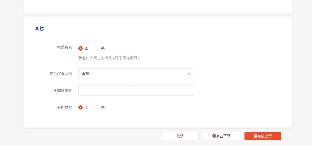6. 在其它欄位輸入其它資訊(例如:較長備貨選項、商品保存狀況等),完成後即可上架您的商品