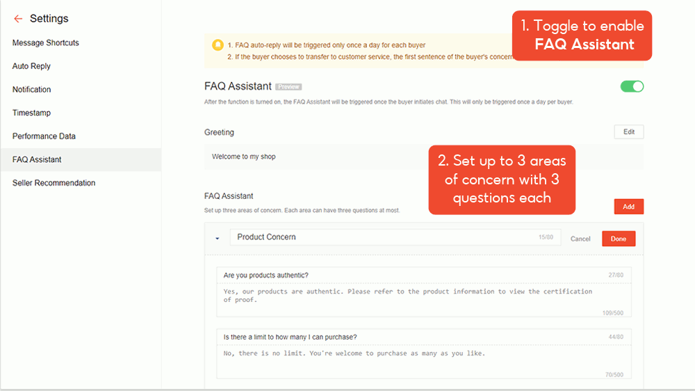 You can prepare a list of commonly asked questions based on past interactions with buyers, and create pre-saved responses accordingly for your FAQ Assistant.