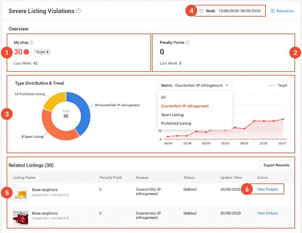 1. My Shop: your performance for the metric in the current and past week, as well as the target you should be meeting