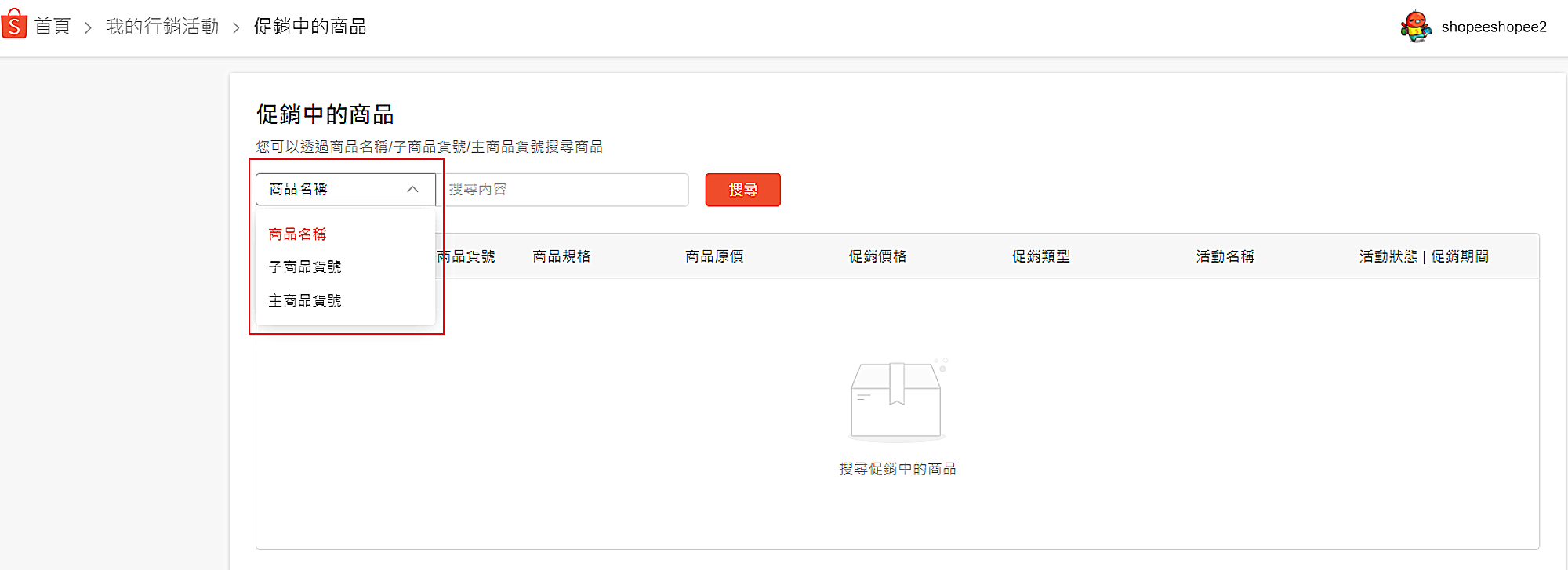 1.您可以透過商品名稱、子商品貨號、主商品貨號,查詢該商品正在進行中以及即將開始的行銷活動