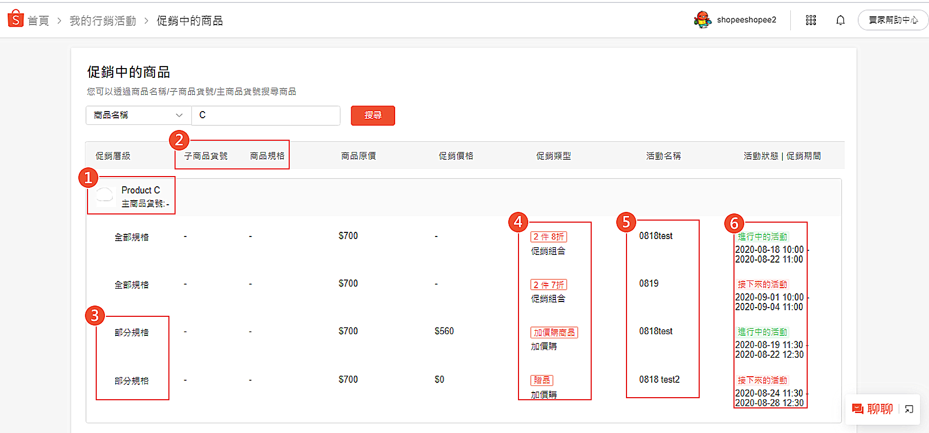 賣家可以針對相同商品新增多個或不同的行銷活動,為了讓您更便利查看商品參加行銷活動的狀態,