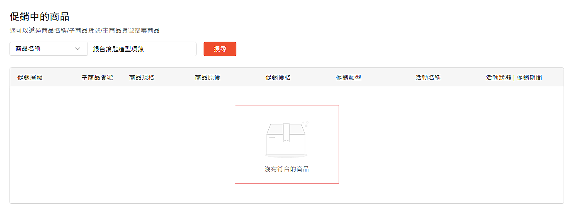 商品未參加任何活動:若搜尋的商品沒有參加任何活動,則搜尋結果會顯示「沒有符合的商品」