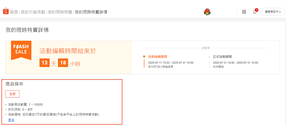 ①您可以於我的限時特賣頁面查看所有已建立的限時特賣活動狀態
