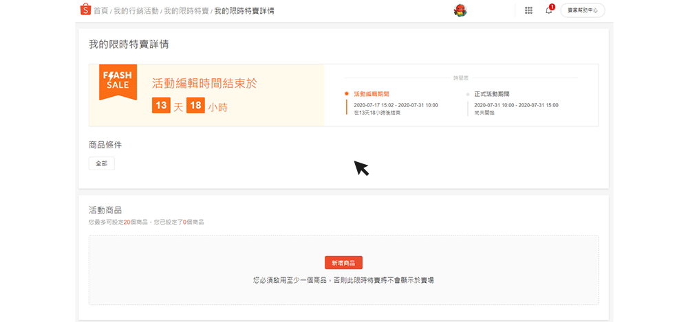 为提供卖家更全面的卖场管理工具,于2020/09/25起所有卖家皆可使用「我的限时特卖」功能!