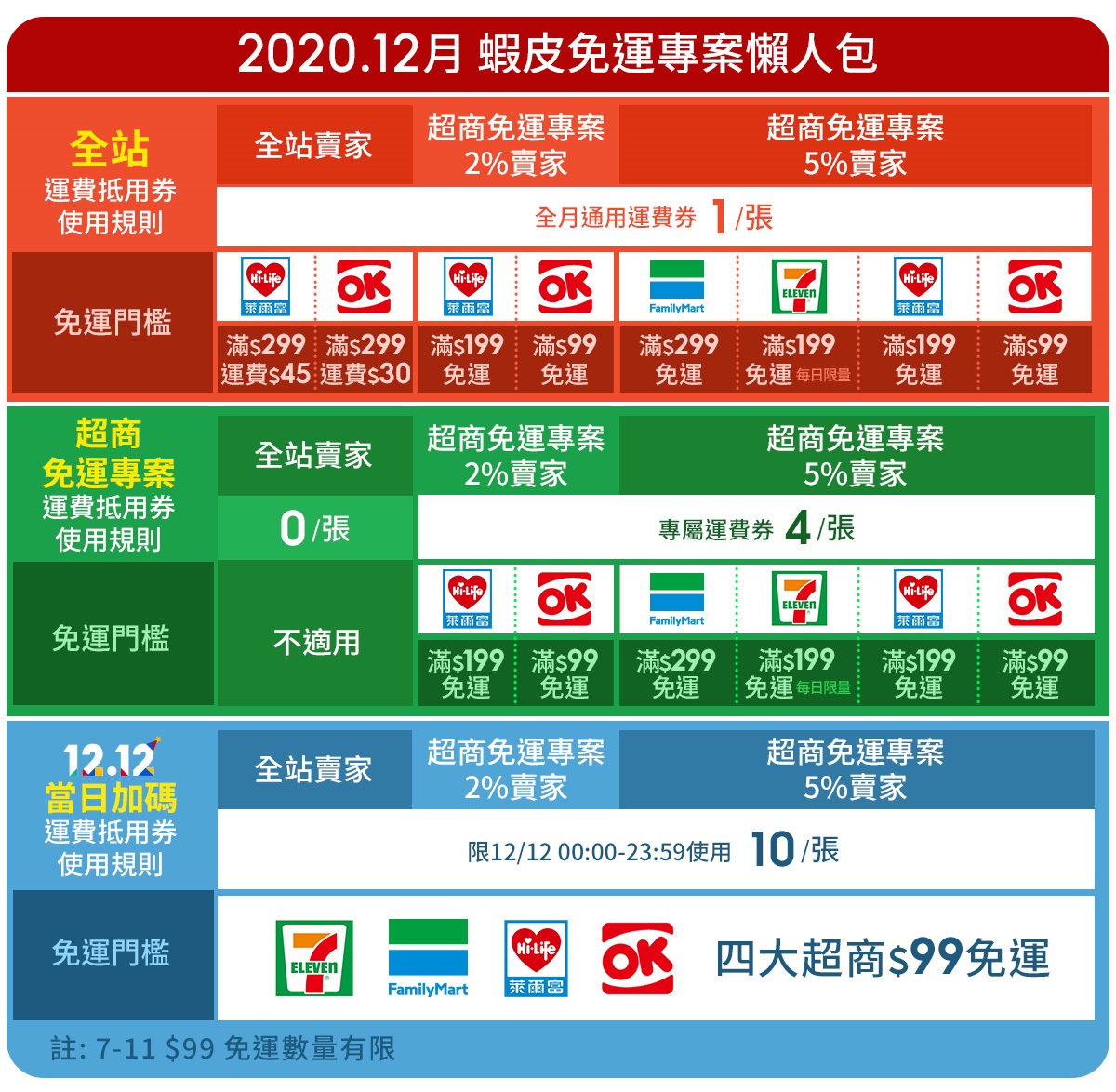 2020年12月蝦皮運費方案適用超商及免運門檻請見下表,活動期間請務必確認於賣場和個別商品都已開啟指定物流,以便享有運費優惠。