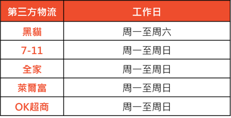 以下提供黑貓宅急便、7-11、全家與萊爾富等第三方物流工作日:
