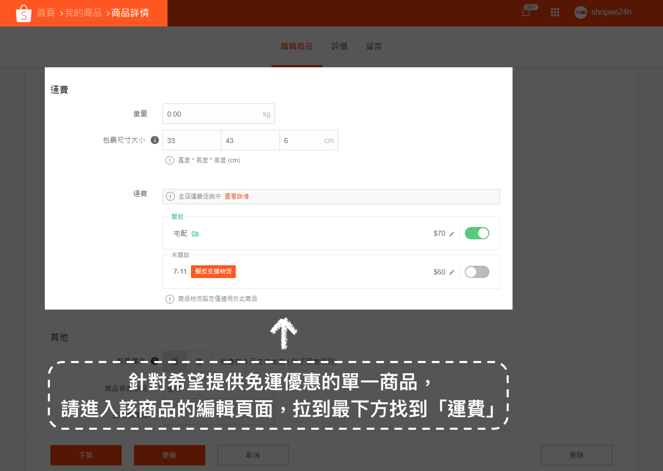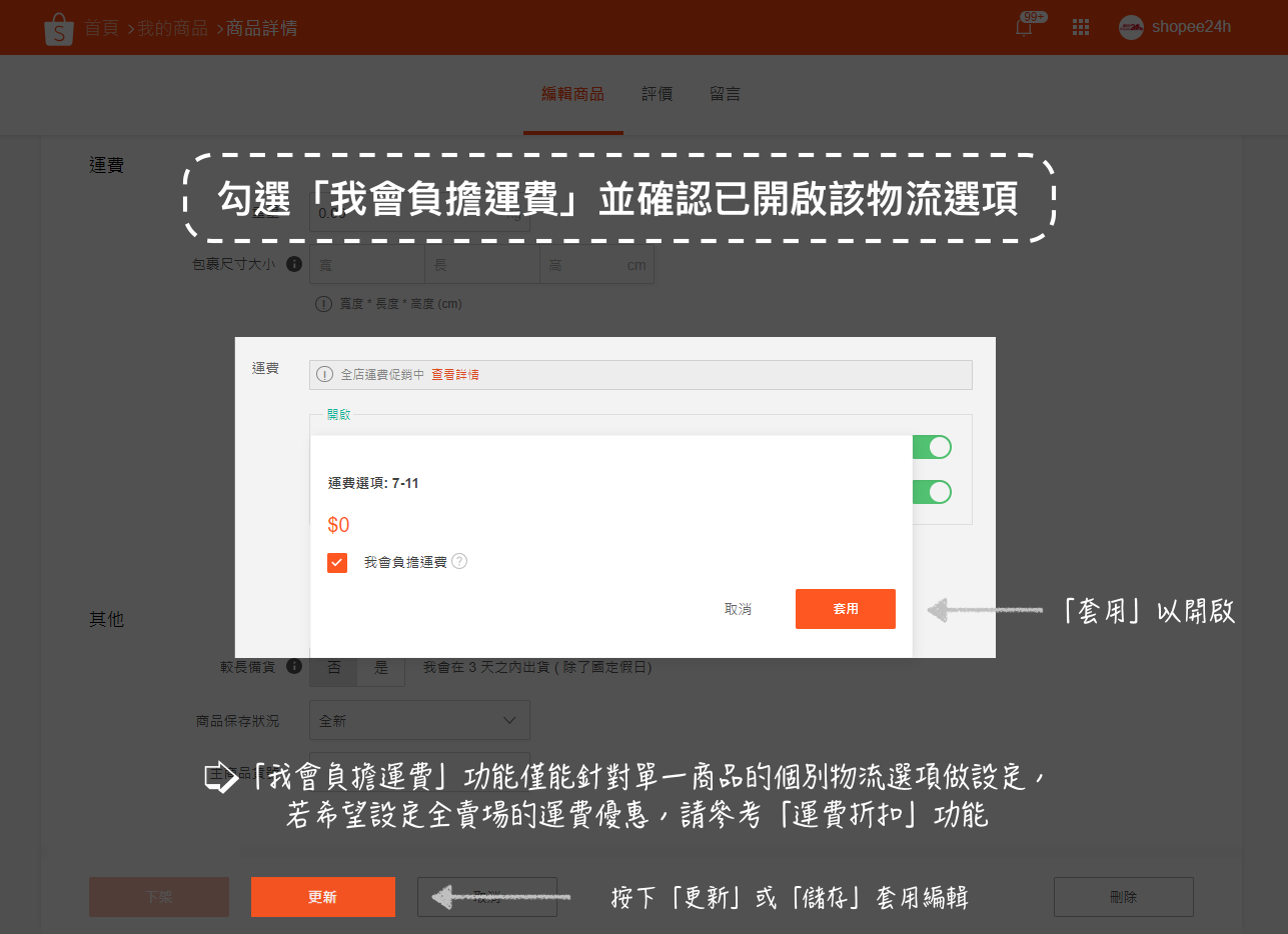 二、為個別商品開啟「我會負擔運費」