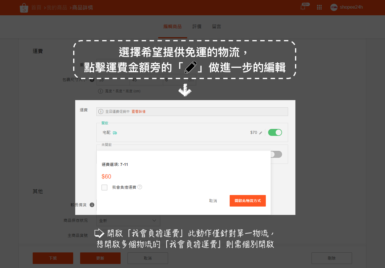 *開啟「我會負擔運費」此動作僅針對單一物流,想開啟多個物流的「我會負擔運費」則需個別開啟