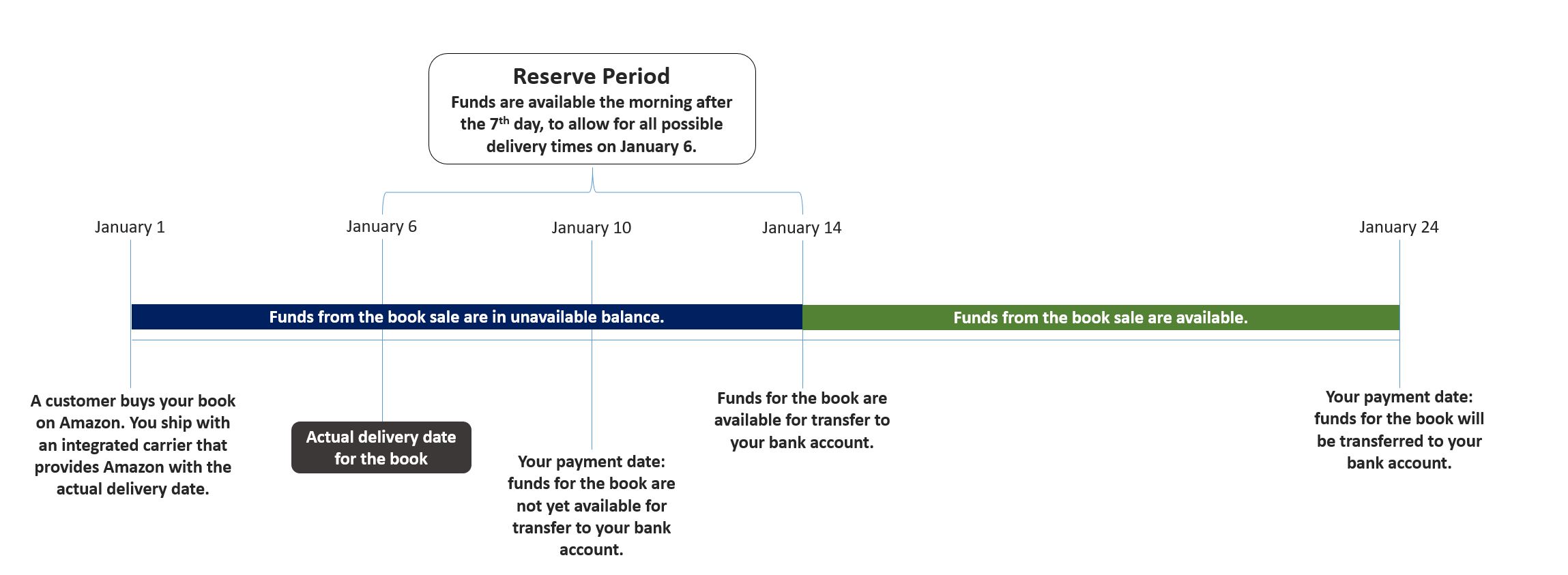 假设您在 1 月 1 日售出了一本图书,预计最迟送达日期为 1 月 12 日。资金在 7 天预留期结束后的次日上午(1 月 20 日)才会到账。然后,您将在下一付款日(在本例中为 1 月 24 日)收到这笔资金。