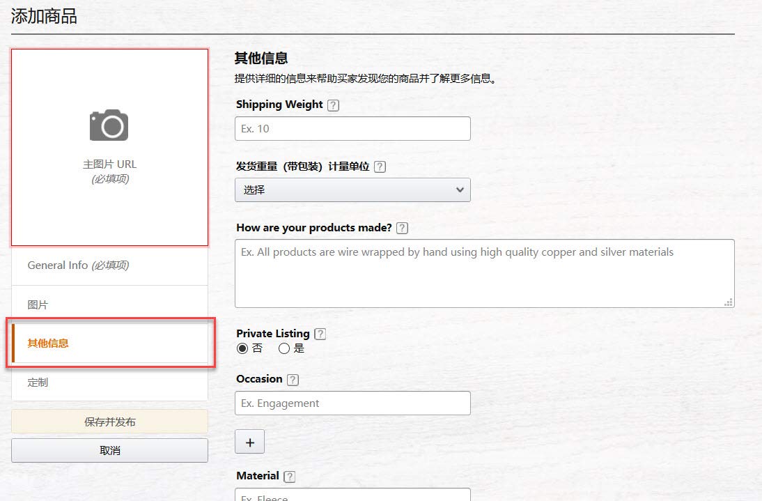 注意: 任何商品均需提供此选项卡中的信息,才可在店铺中上线。