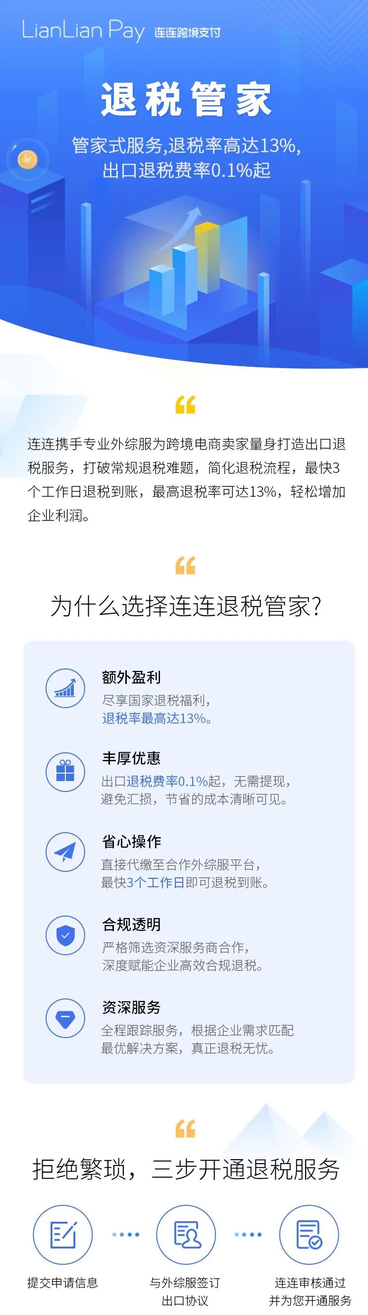 为充分赋能跨境电商行业,连连携手专业外综服为跨境电商卖家量身打造出口退税服务,打破常规退税难题,简化退税流程,最快3个工作日退税到账,最高退税率可达13%,让卖家轻松增加企业利润。